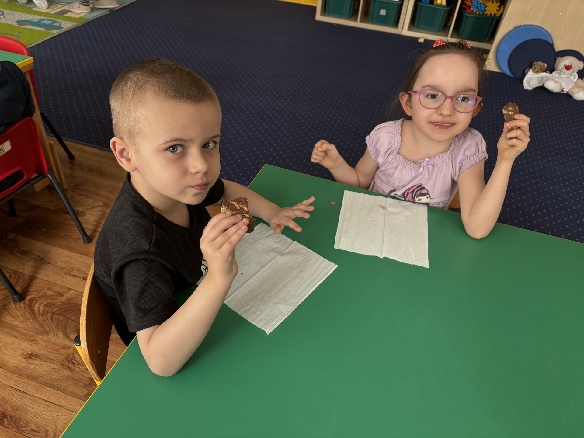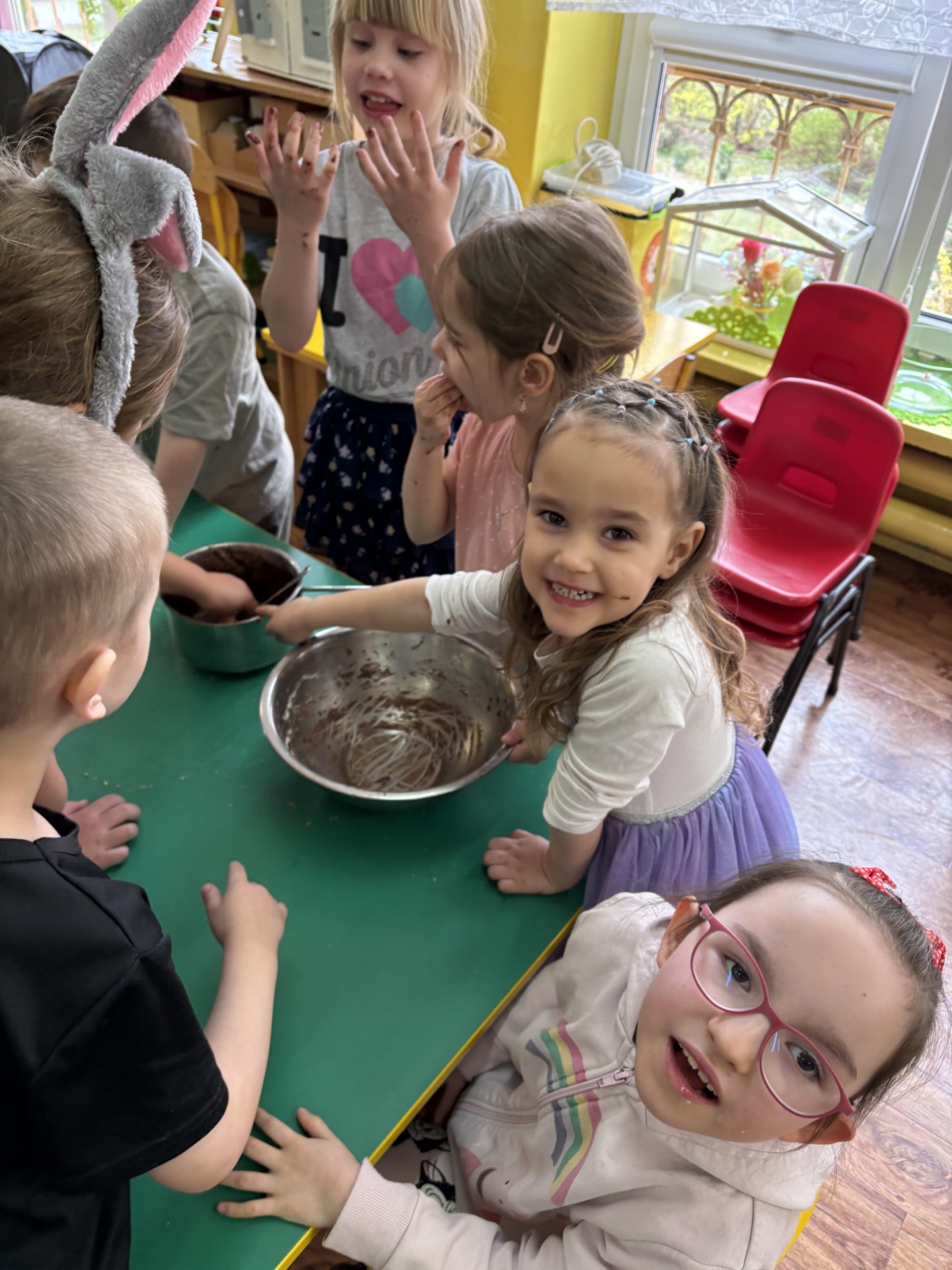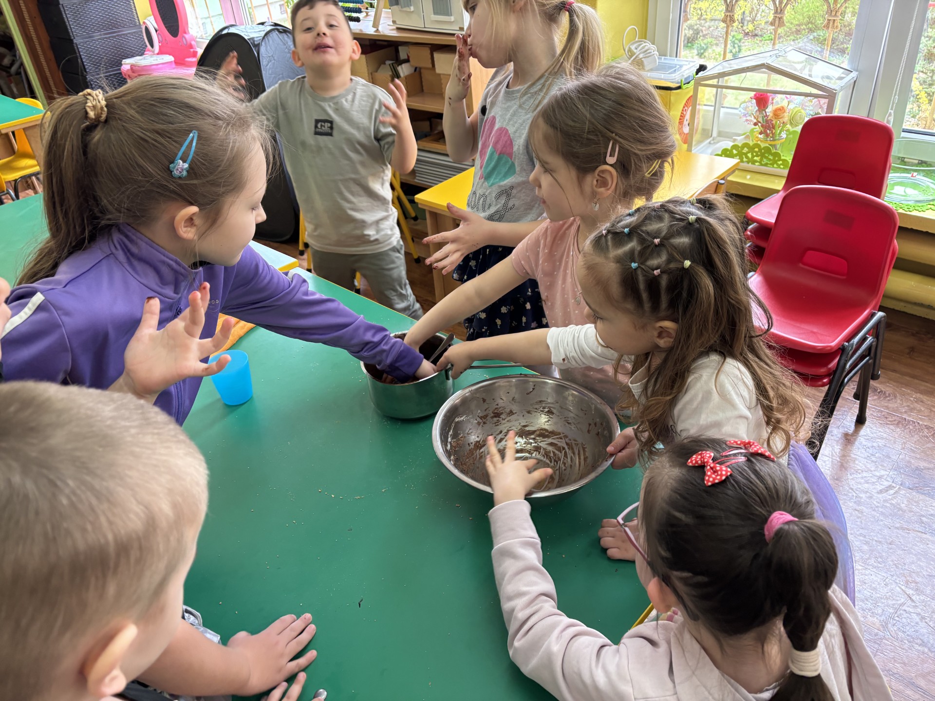13 kwietnia obchodziliśmy "Dzień czekolady". Poznaliśmy historię tego słodkiego przysmaku. Smakowaliśmy kakao i inne składniki, które wchodzą w skład bloku czekoladowego i który sami zrobiliśmy. Po obiedzie nastąpiła degustacja. To był bardzo słodki dzień!