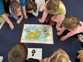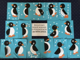 20 stycznia obchodziliśmy w klasie "Dzień wiedzy o pingwinach". Tego dnia dowiedzieliśmy się o ich miejscu zamieszkania, wyglądzie, nawykach żywieniowych, sposobie poruszania i wydawanych dźwiękach. Uczyliśmy się rysować pingwina. Bawiliśmy się przy muzyce oraz wykonaliśmy pracę plastyczną - origami płaskie z koła.