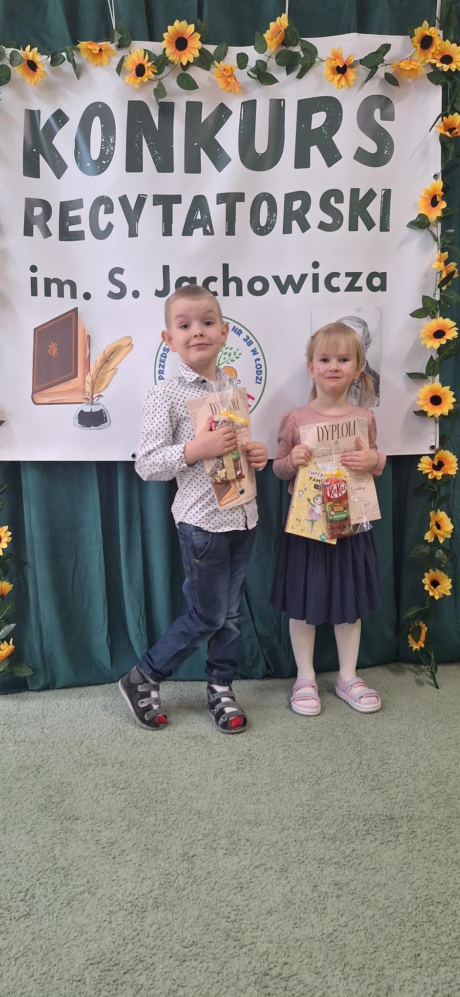 14 kwietnia nasze przedszkolaki (Kuba i Julka) wzięły udział w konkursie recytatorskim im. S. Jachowicza, który odbył się w Przedszkolu Miejskim nr 38 w Łodzi. Dumnie reprezentowali naszą placówkę, pięknie recytując wiersze polskich poetów. Gratulujemy!!!