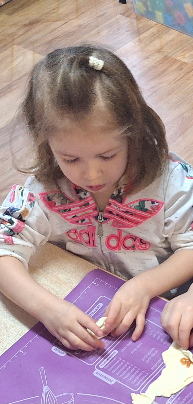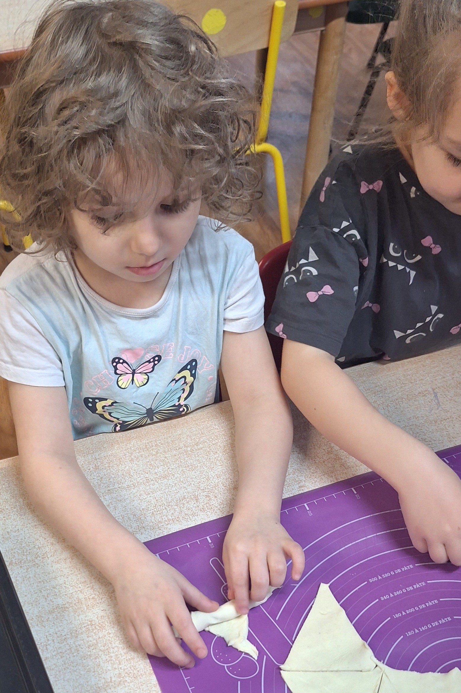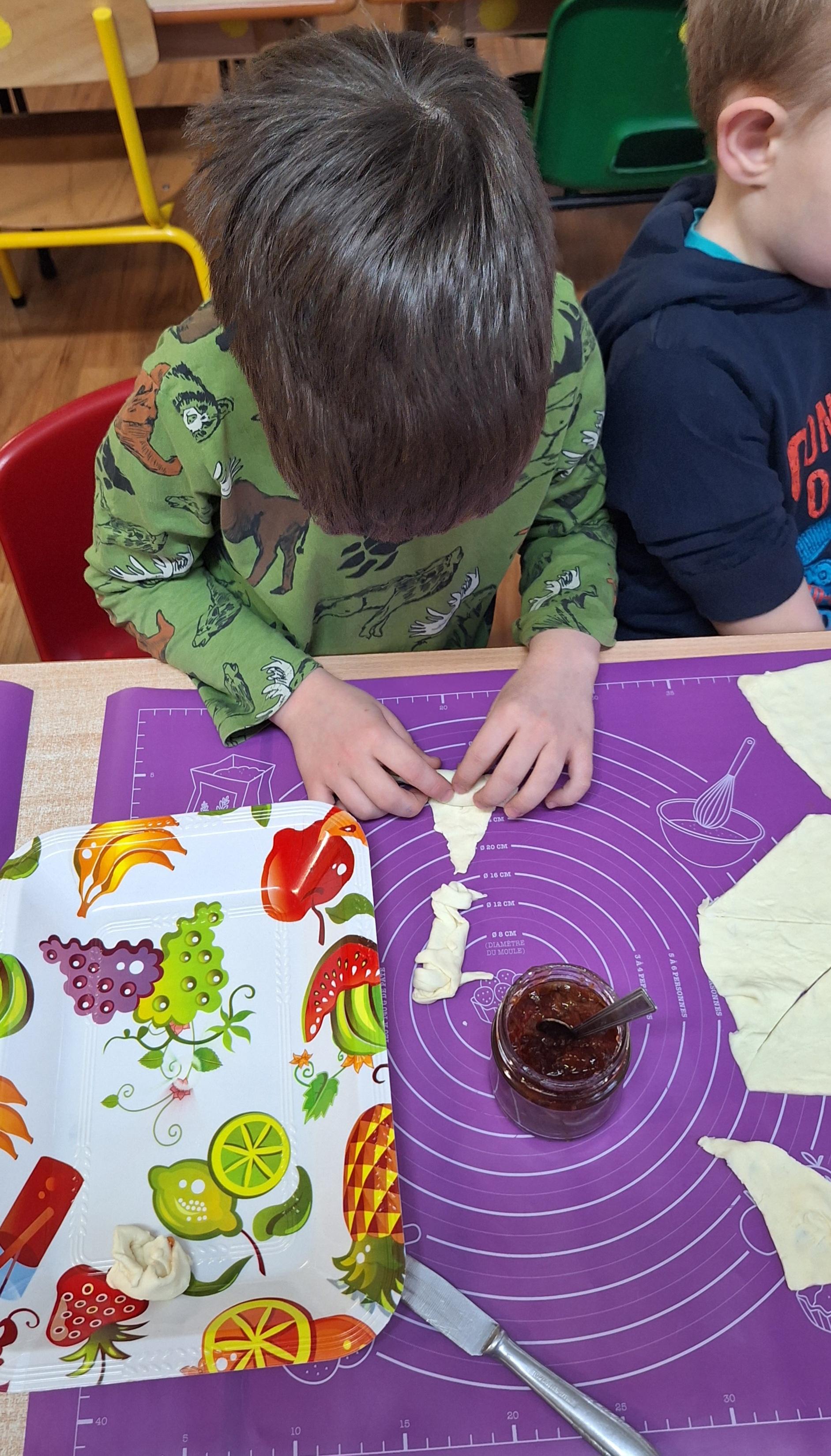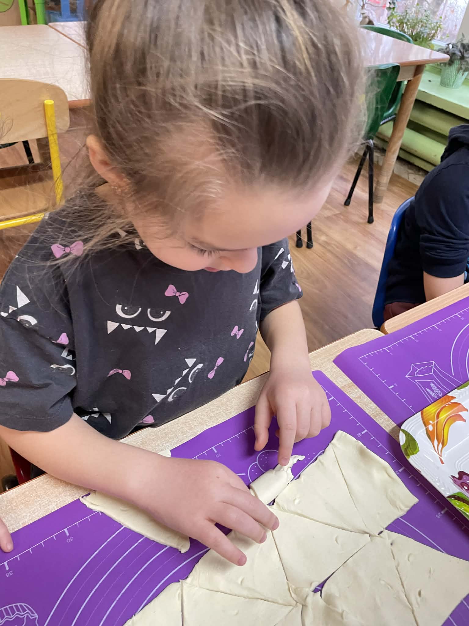 W tłusty czwartek dzieci z grupy III samodzielnie przygotowały rogaliki. Wałkowały ciasto, nakładały dżem i zawijały ciasto. Na koniec degustowały upieczone słodkości.