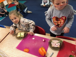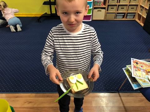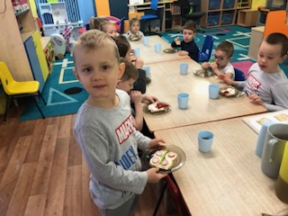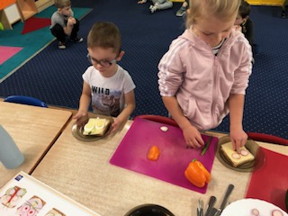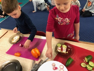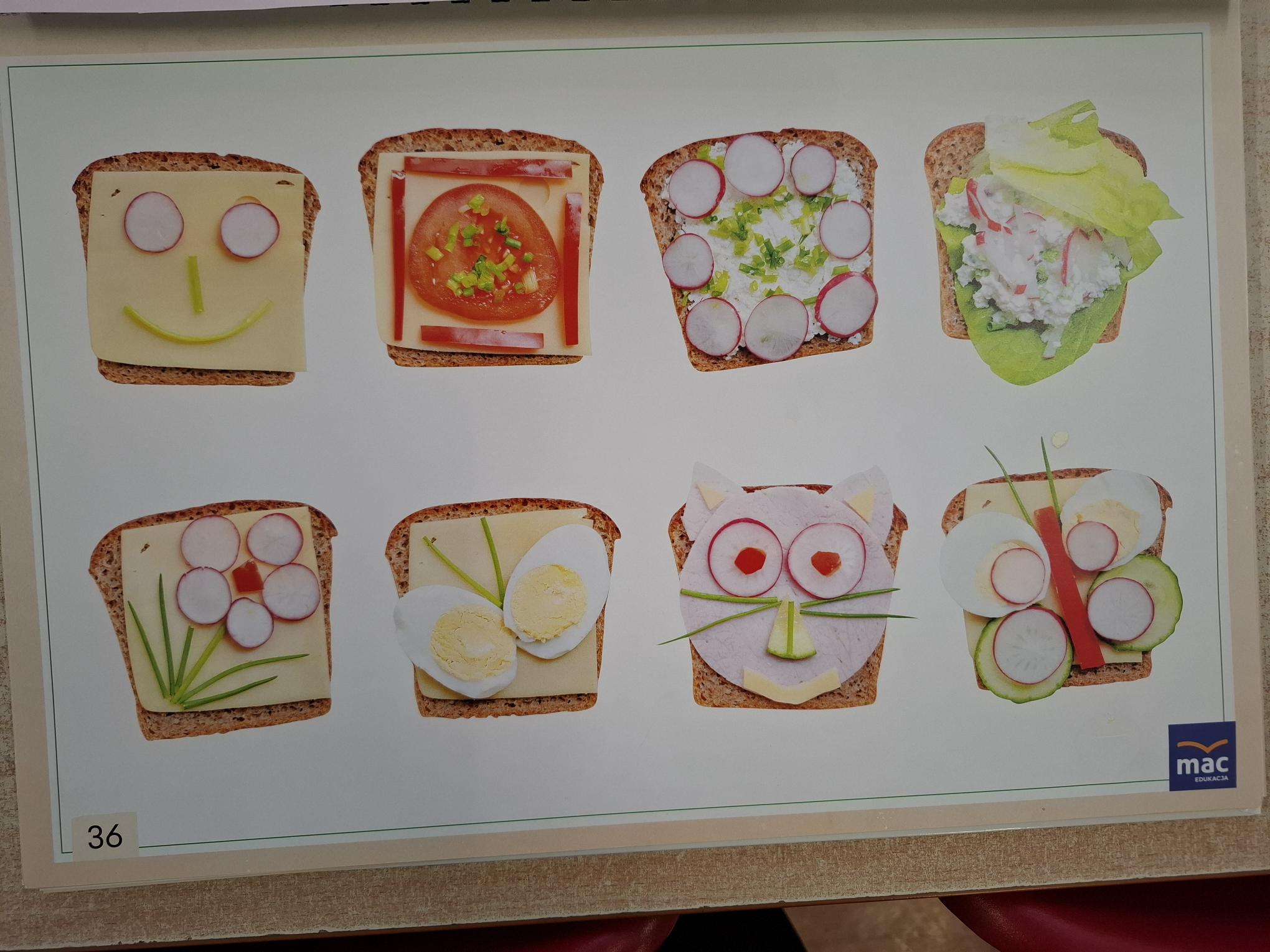 Podczas warsztatów kulinarnych „Kolorowe śniadanie” dzieci z wielkim entuzjazmem przygotowywały własne kanapki. Powstały wesołe i kolorowe motylki, Mikołajki oraz bałwanki. Mali kucharze samodzielnie dobierali składniki, ćwicząc przy tym kreatywność i zdolności manualne. Wszystkim bardzo smakowało to, co sami przygotowali, a zajęcia sprawiły dzieciom mnóstwo radości.