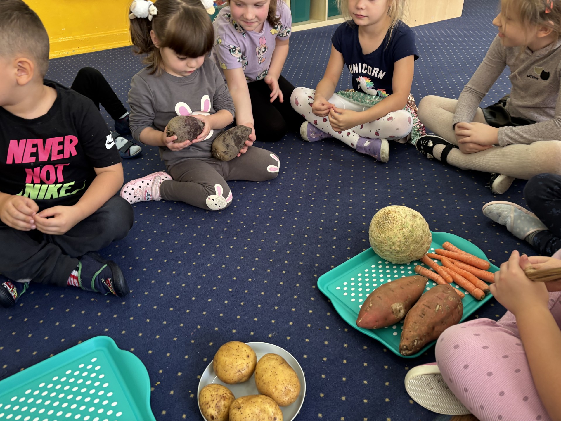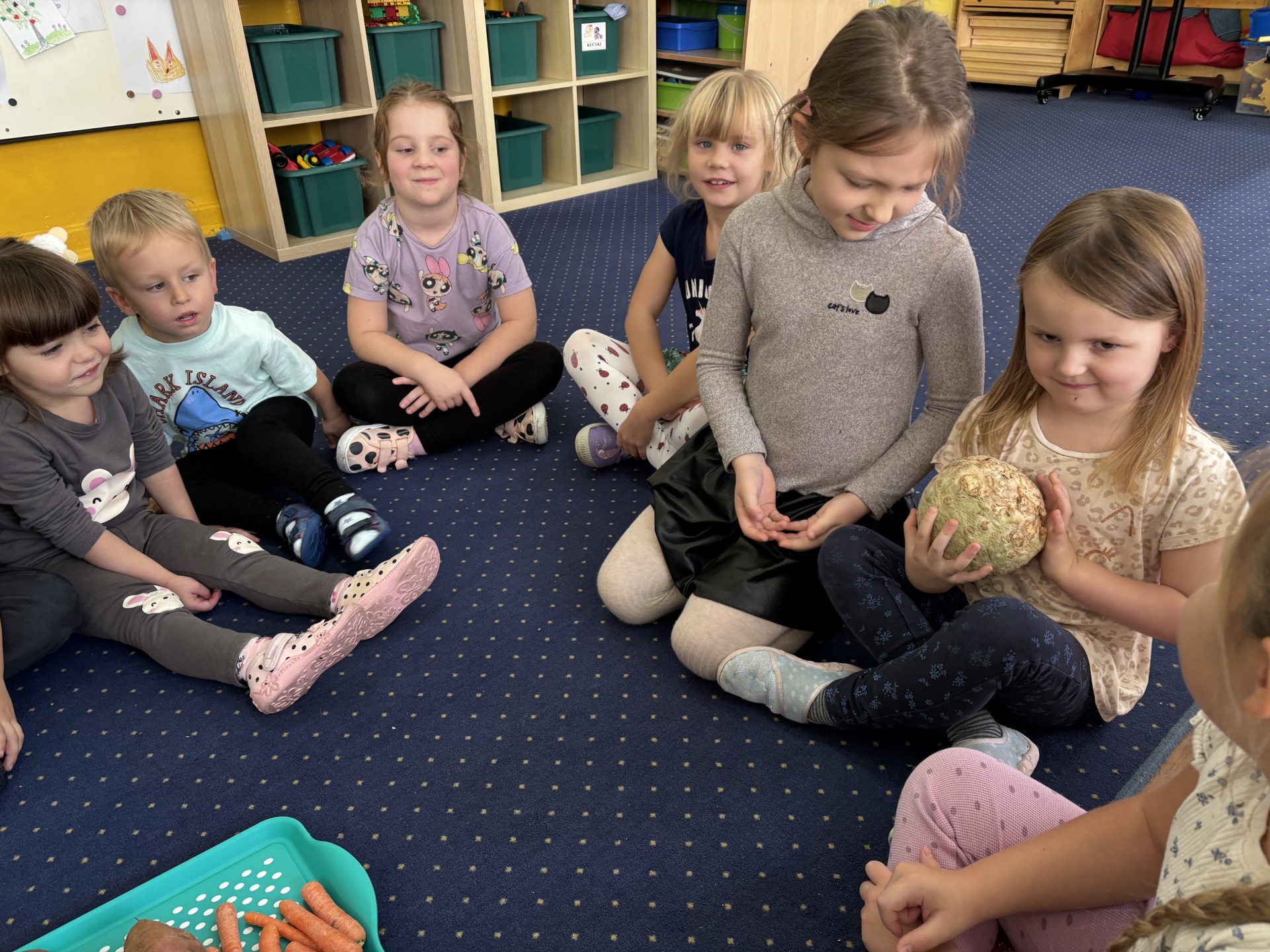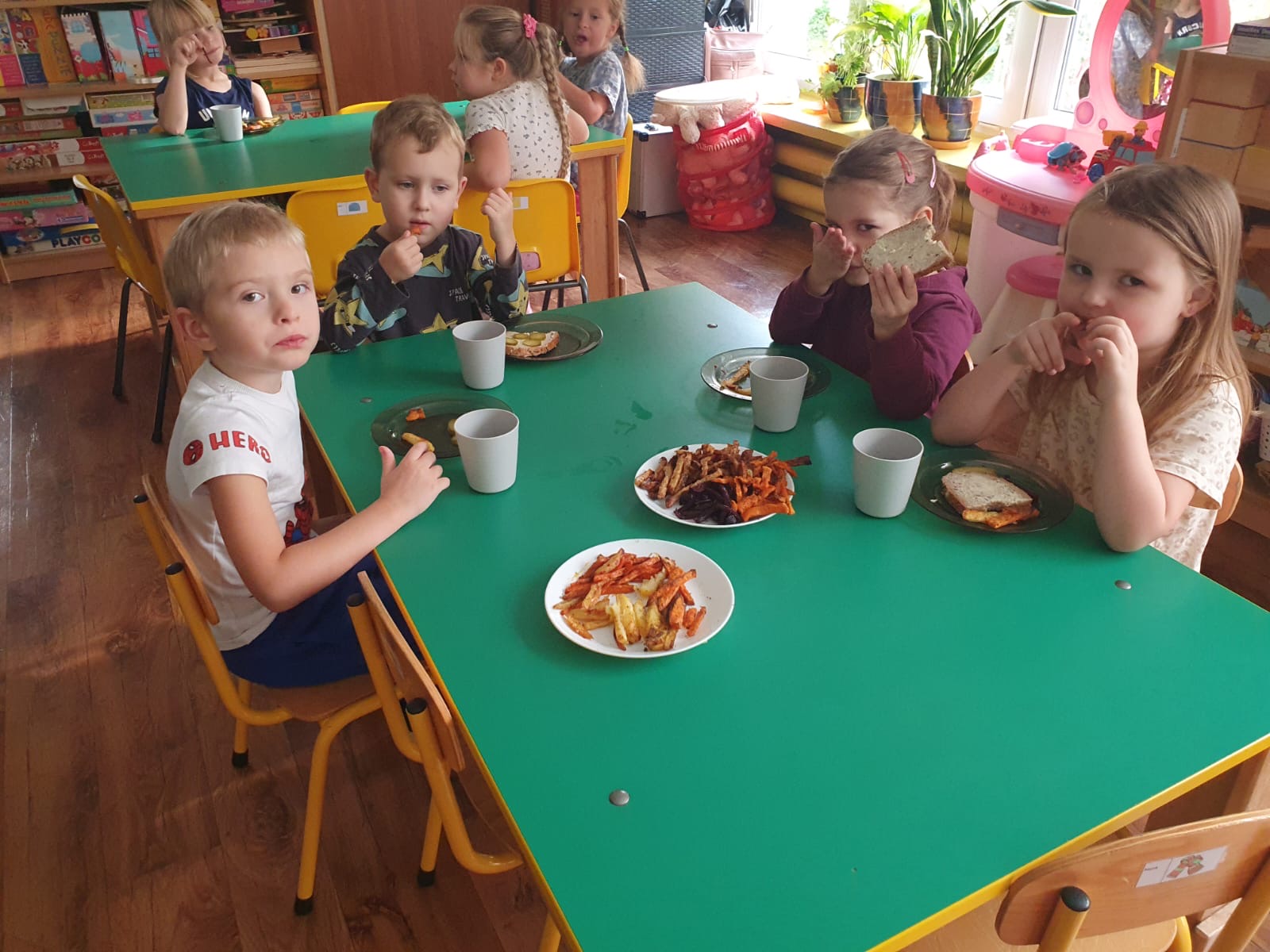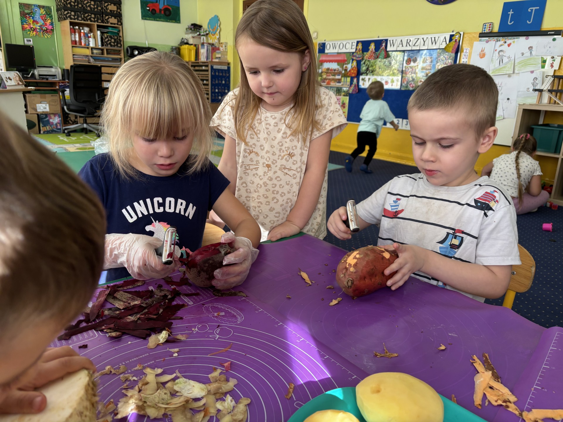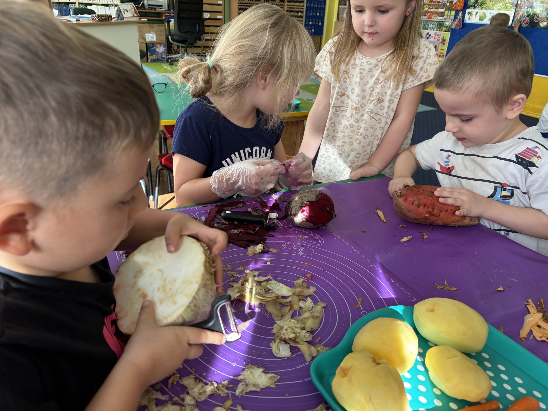 W tym tygodniu poznawaliśmy warzywa i ich wartości odżywcze. Wykonaliśmy frytki z selera, marchewki, buraka, ziemniaka i batata, które degustowaliśmy. Wykonaliśmy również pace plastyczne pt. "Warzywny świat".