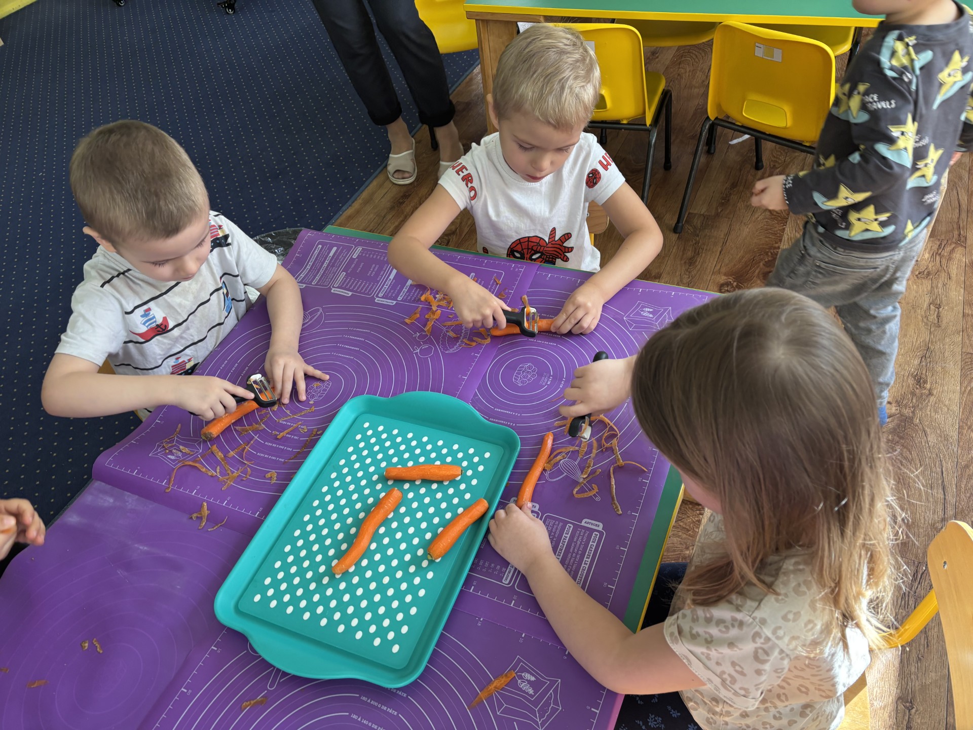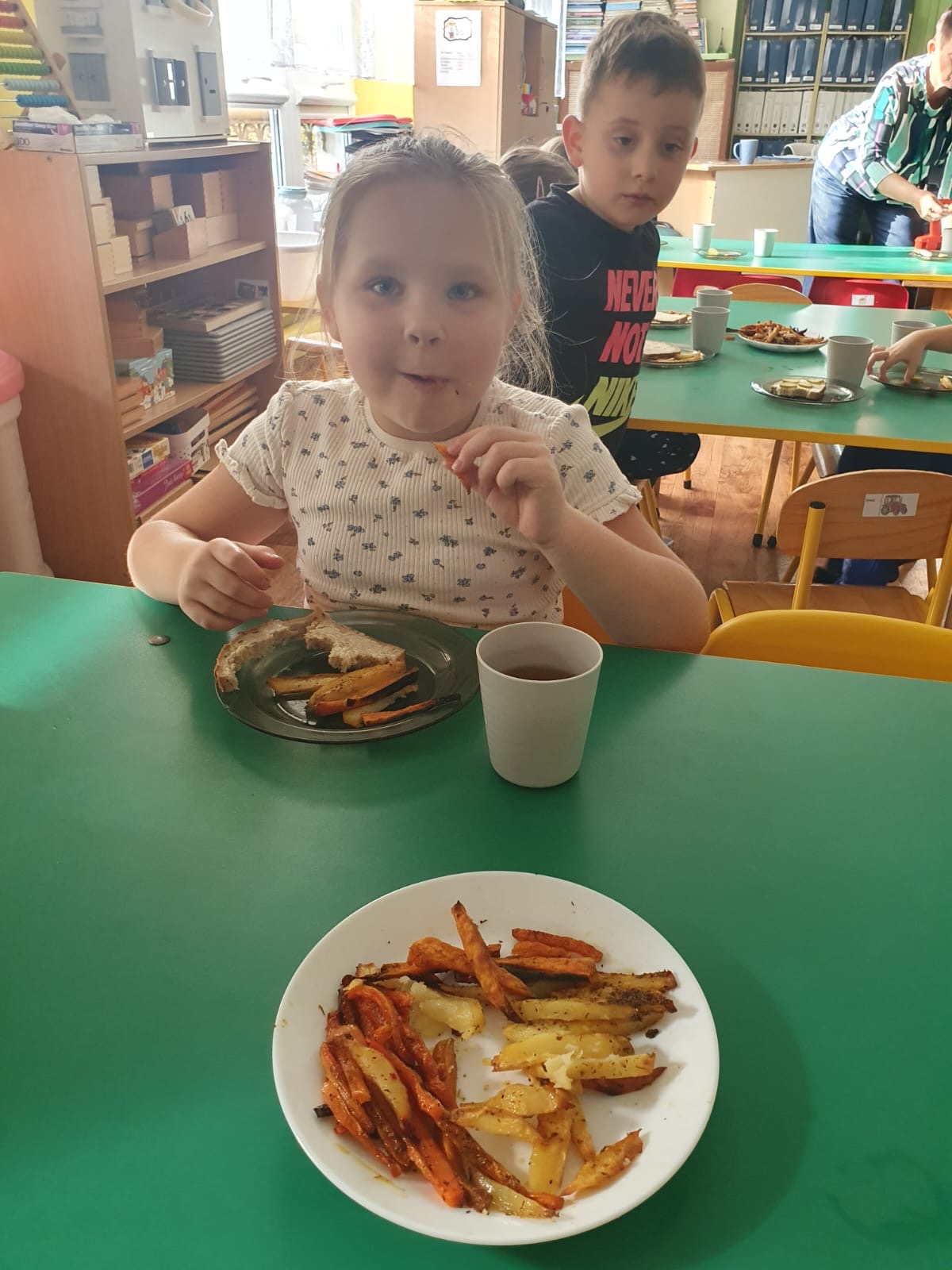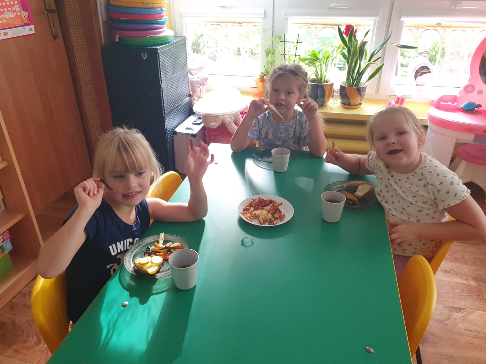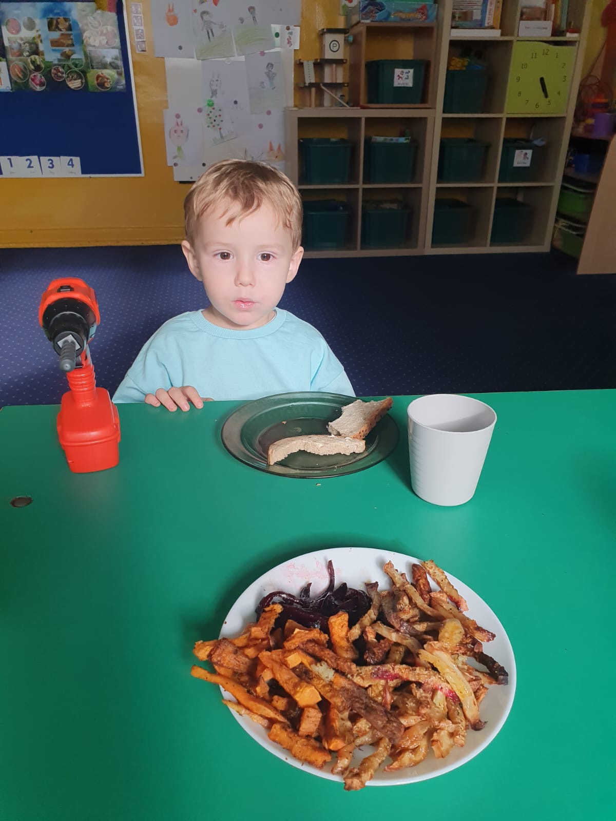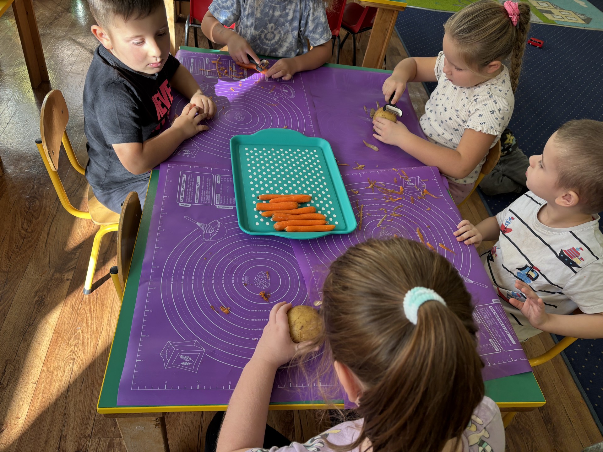 W tym tygodniu poznawaliśmy warzywa i ich wartości odżywcze. Wykonaliśmy frytki z selera, marchewki, buraka, ziemniaka i batata, które degustowaliśmy. Wykonaliśmy również pace plastyczne pt. "Warzywny świat".
