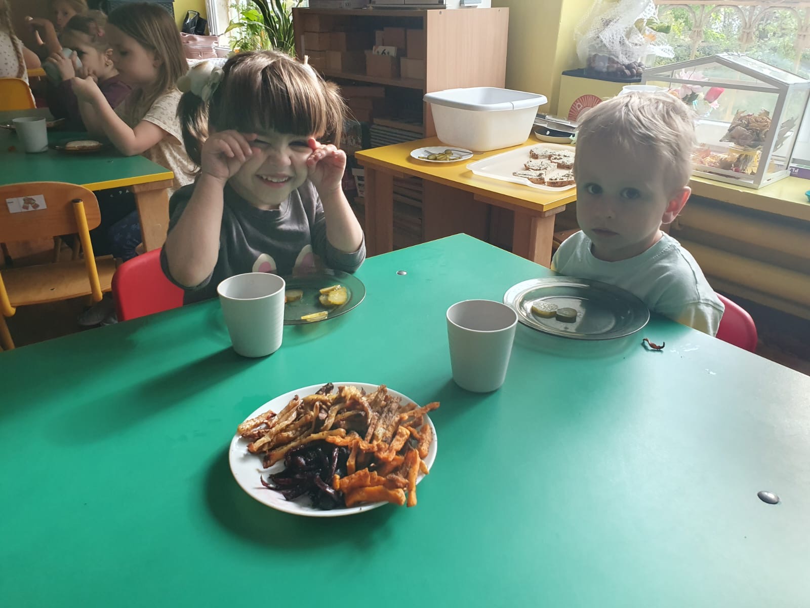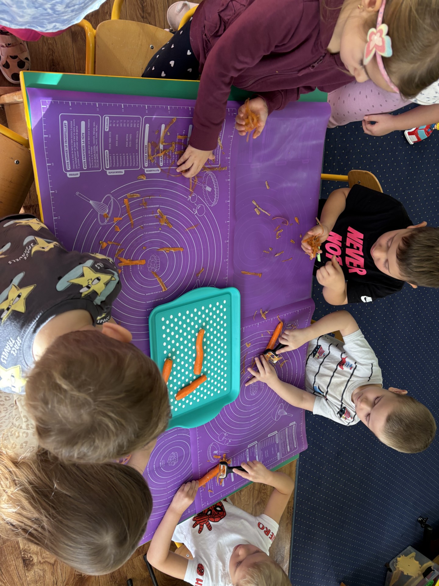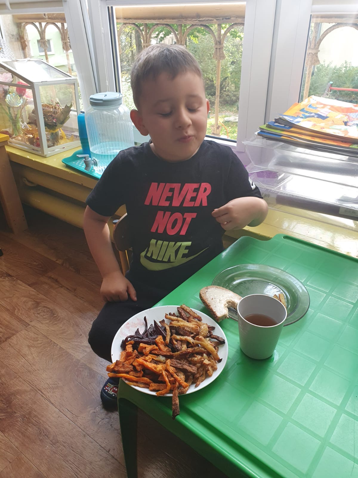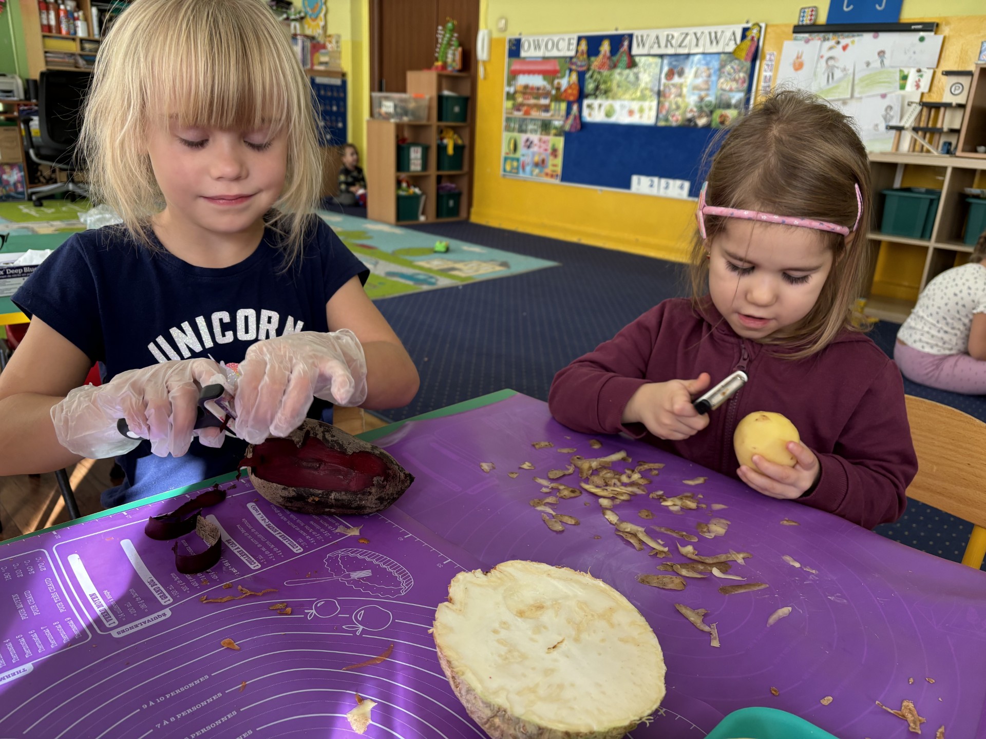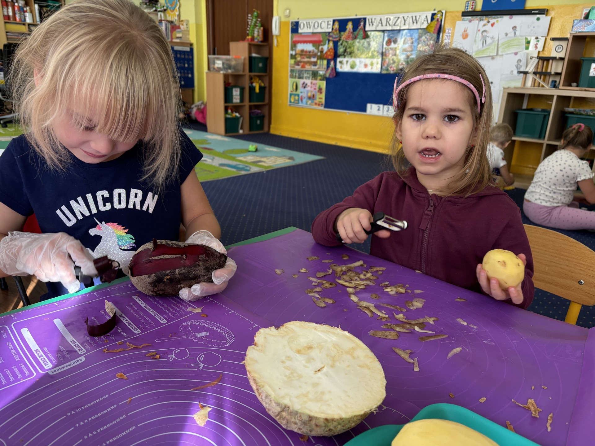 W tym tygodniu poznawaliśmy warzywa i ich wartości odżywcze. Wykonaliśmy frytki z selera, marchewki, buraka, ziemniaka i batata, które degustowaliśmy. Wykonaliśmy również pace plastyczne pt. "Warzywny świat".