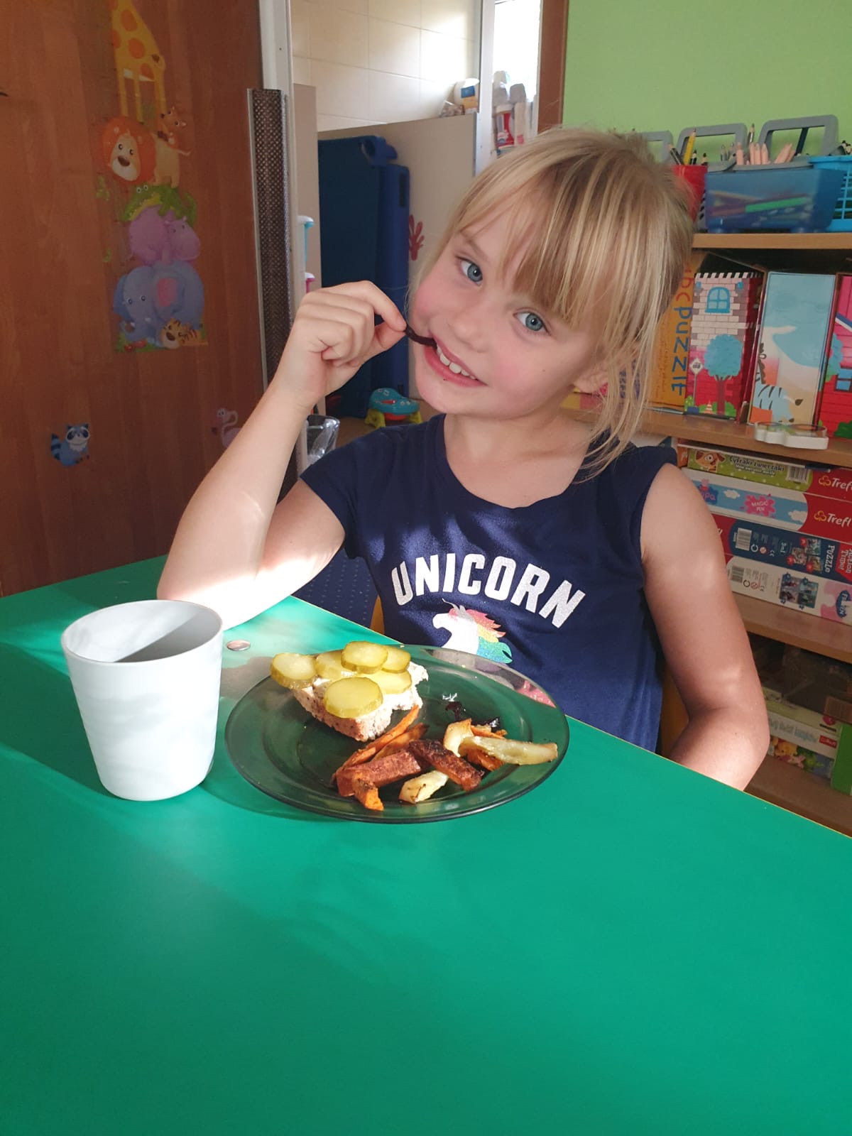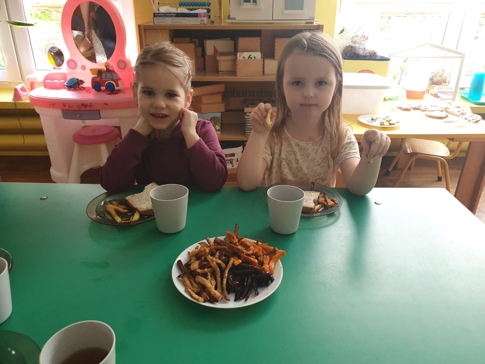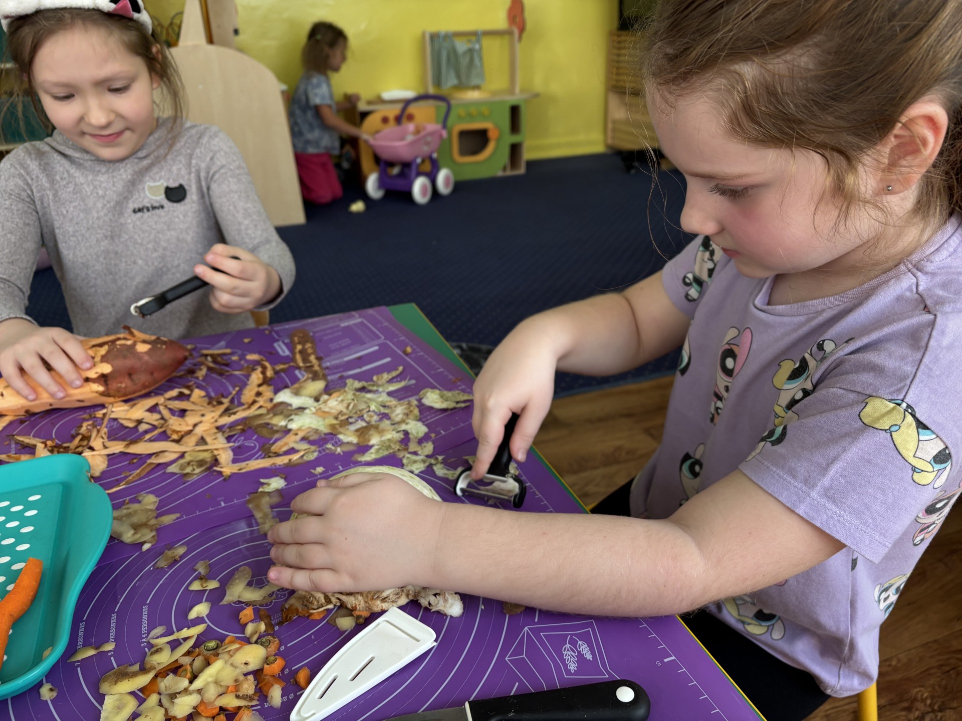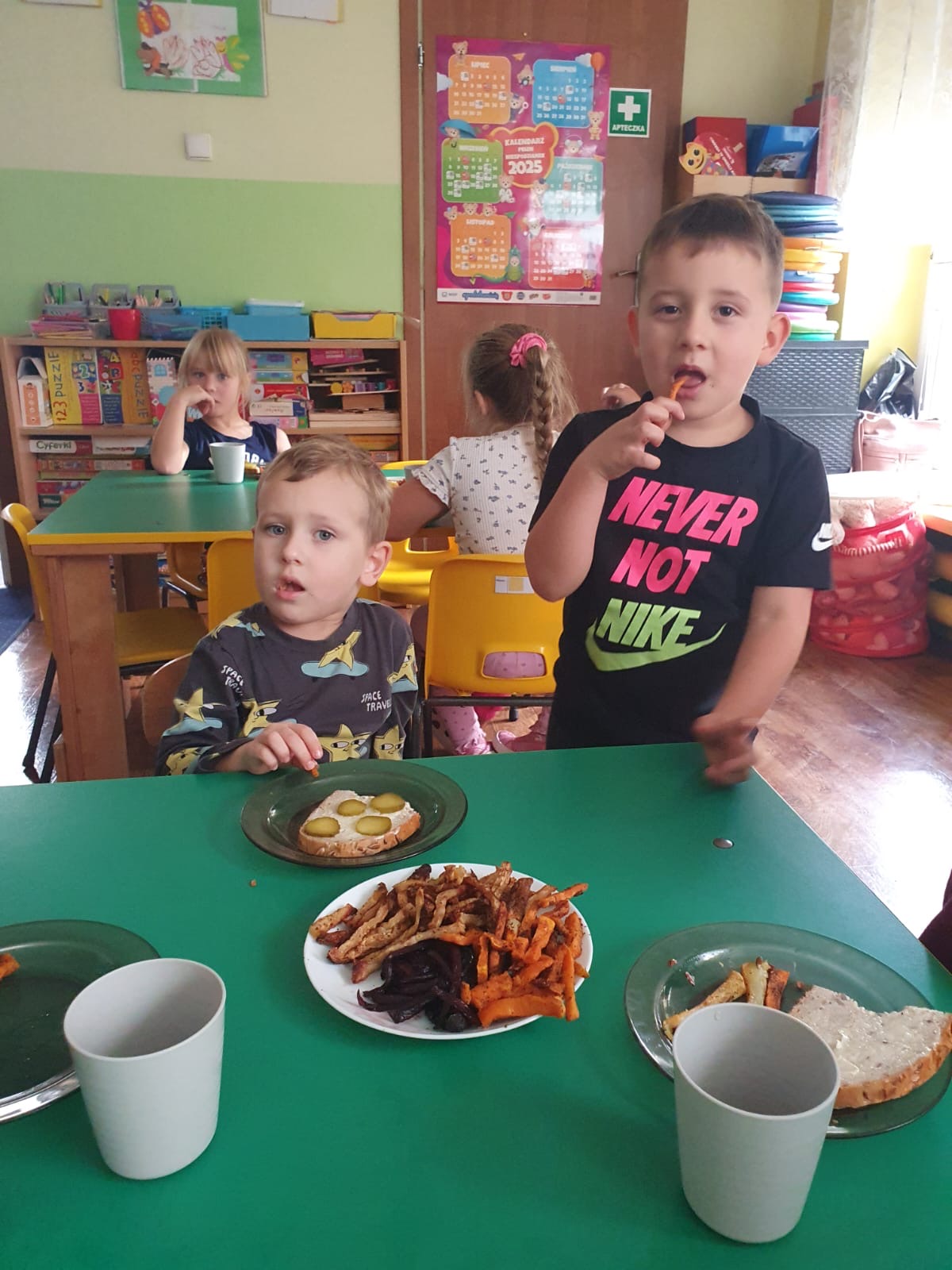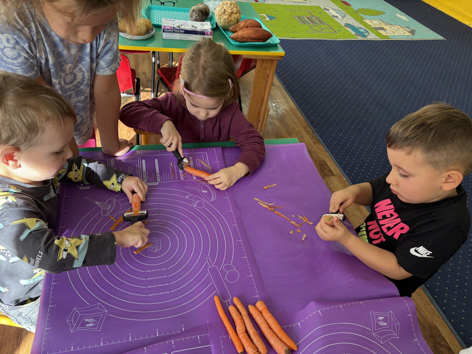 W tym tygodniu poznawaliśmy warzywa i ich wartości odżywcze. Wykonaliśmy frytki z selera, marchewki, buraka, ziemniaka i batata, które degustowaliśmy. Wykonaliśmy również pace plastyczne pt. "Warzywny świat".