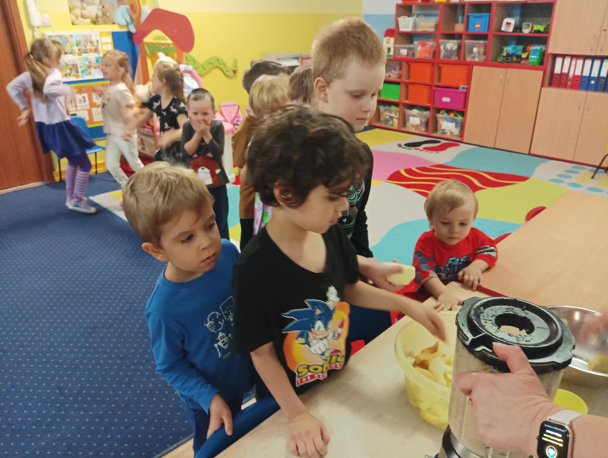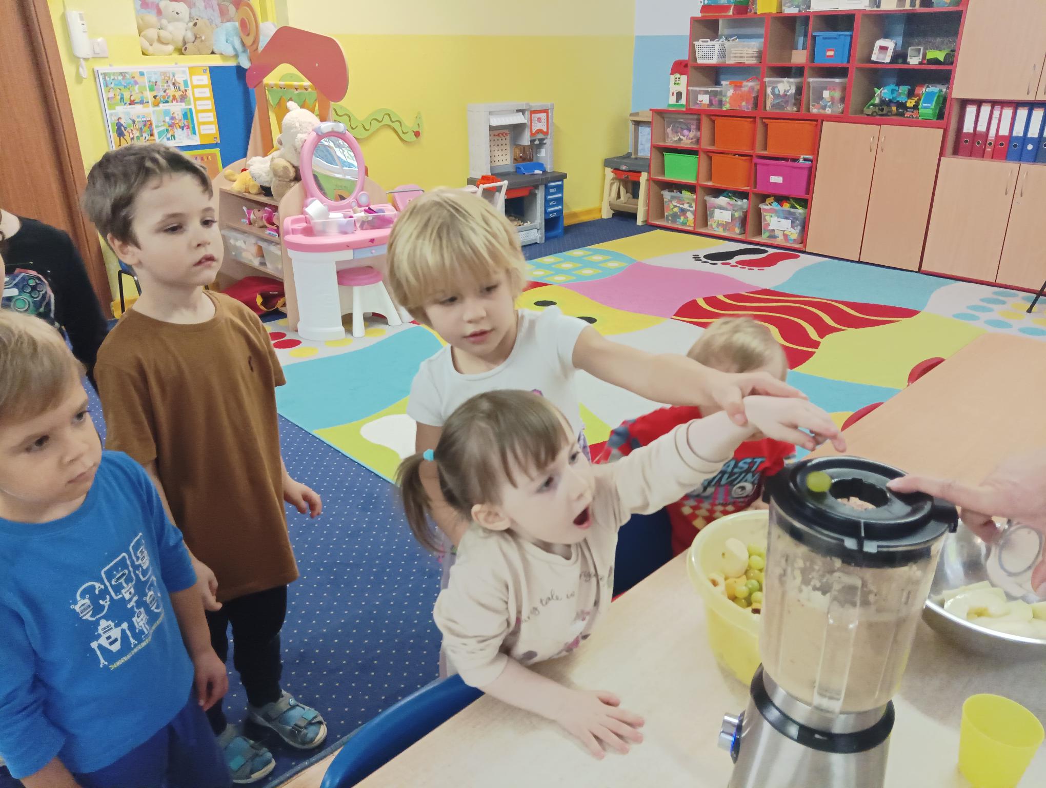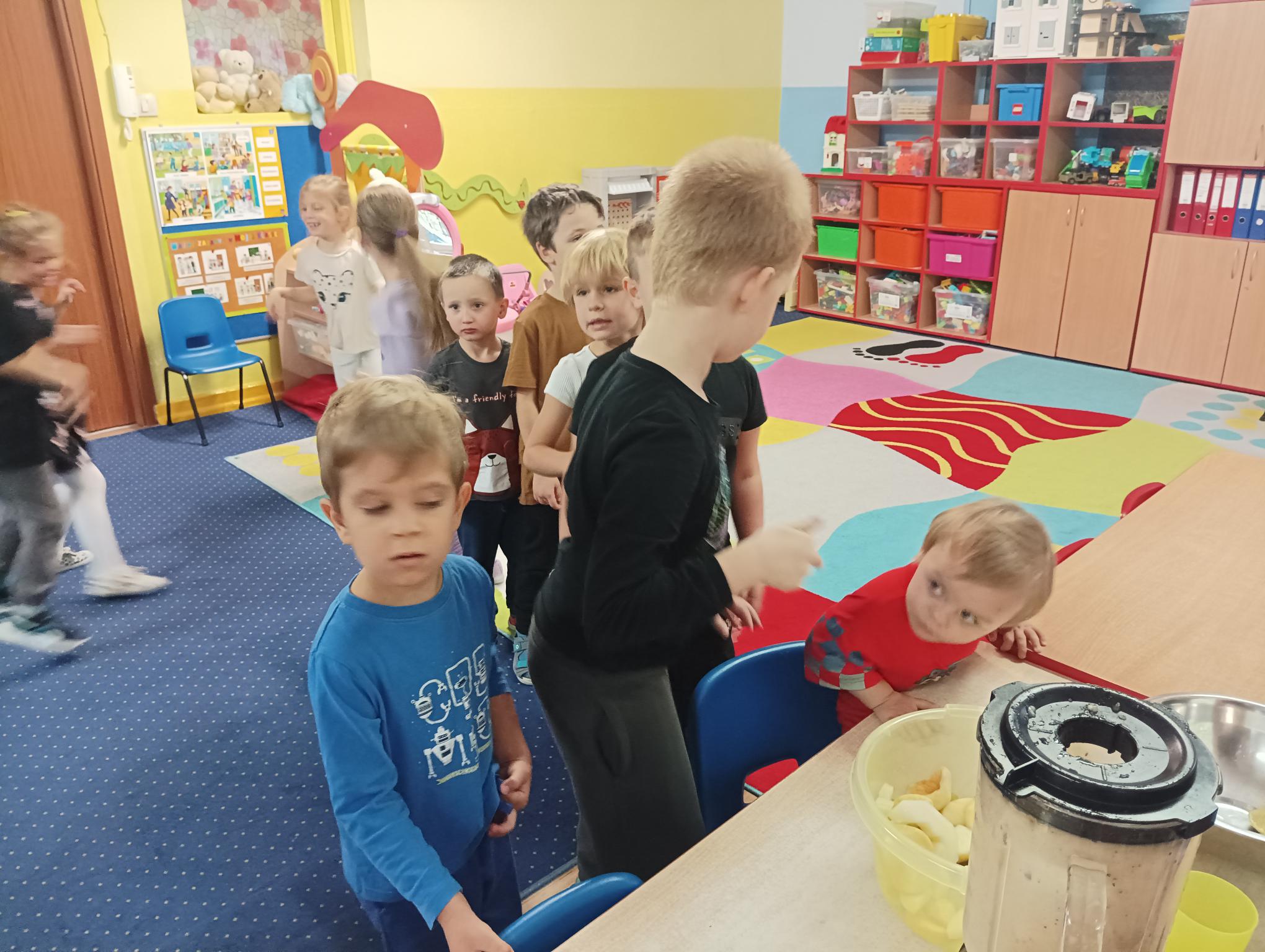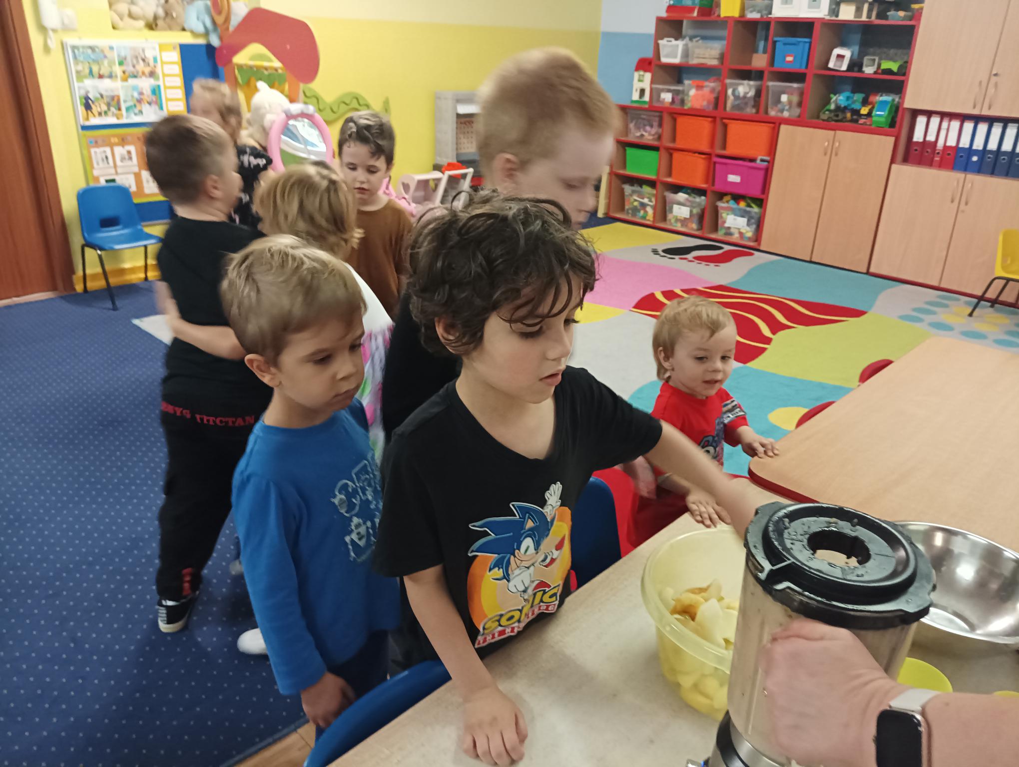 Podczas owocowego tygodnia dzieci przygotowywały sok z przyniesionych jabłek, gruszek. śliwek, pomarańczy i innych pysznych owoców.
