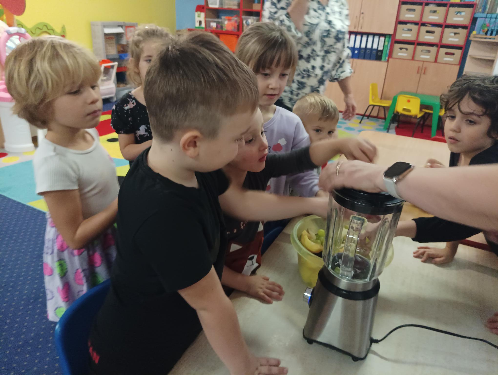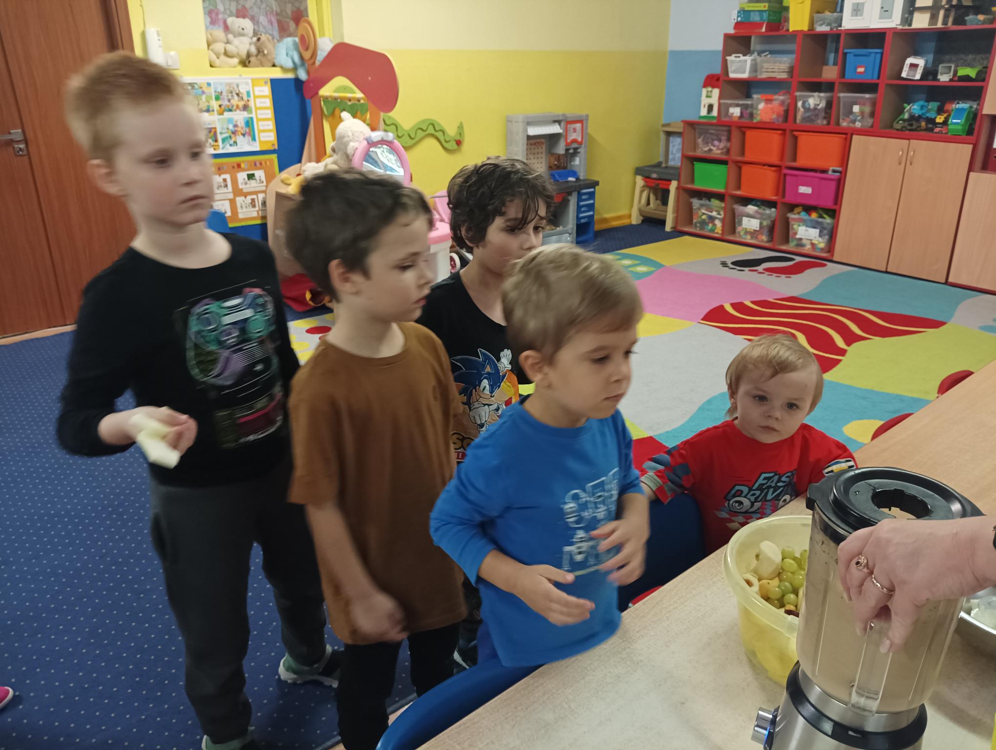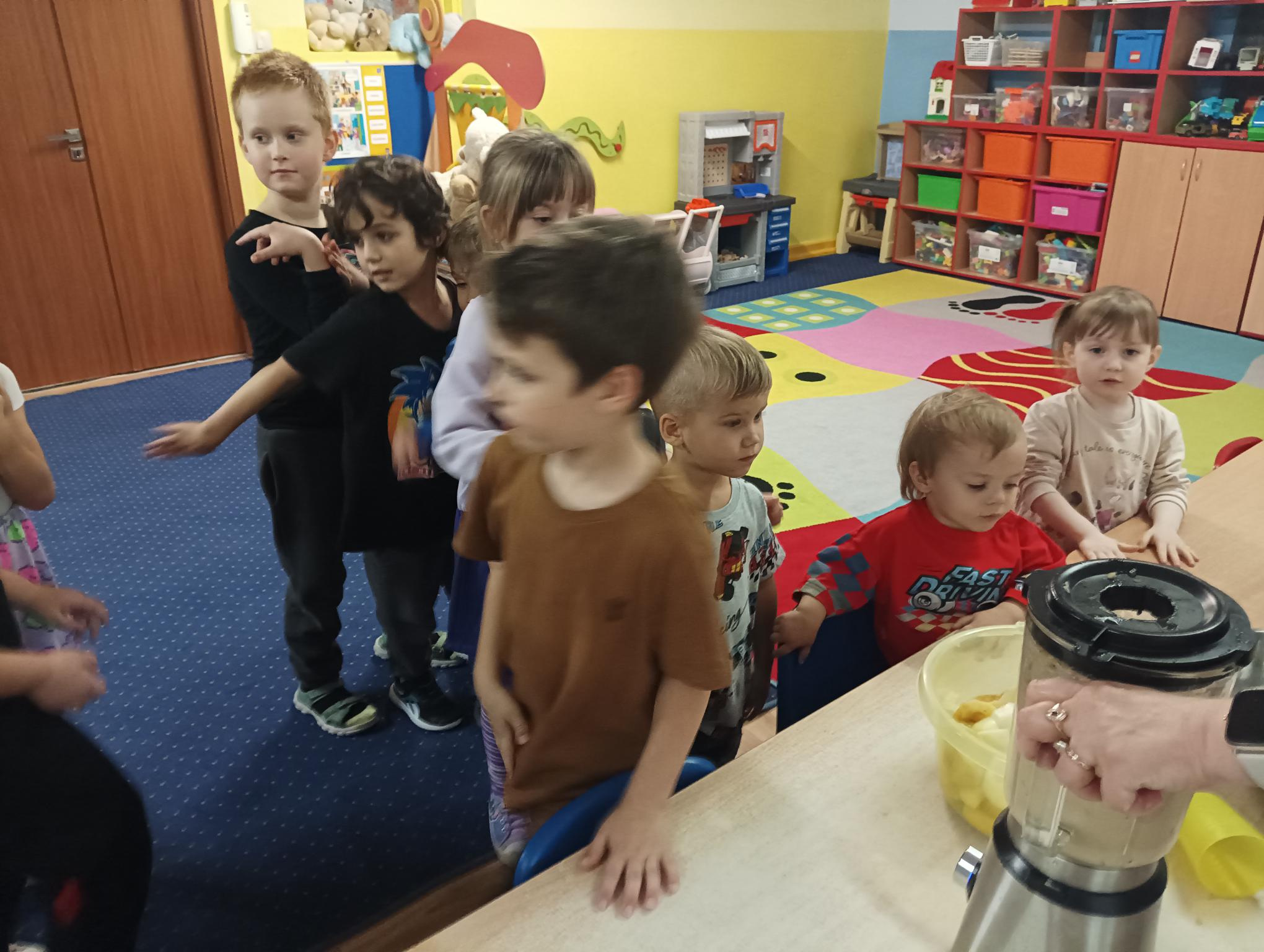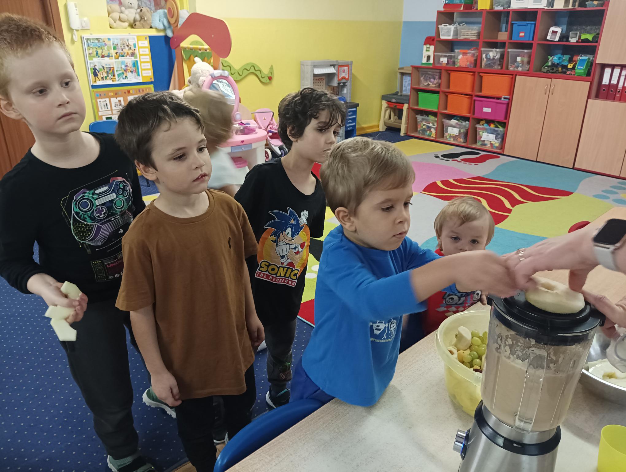 Podczas owocowego tygodnia dzieci przygotowywały sok z przyniesionych jabłek, gruszek. śliwek, pomarańczy i innych pysznych owoców.