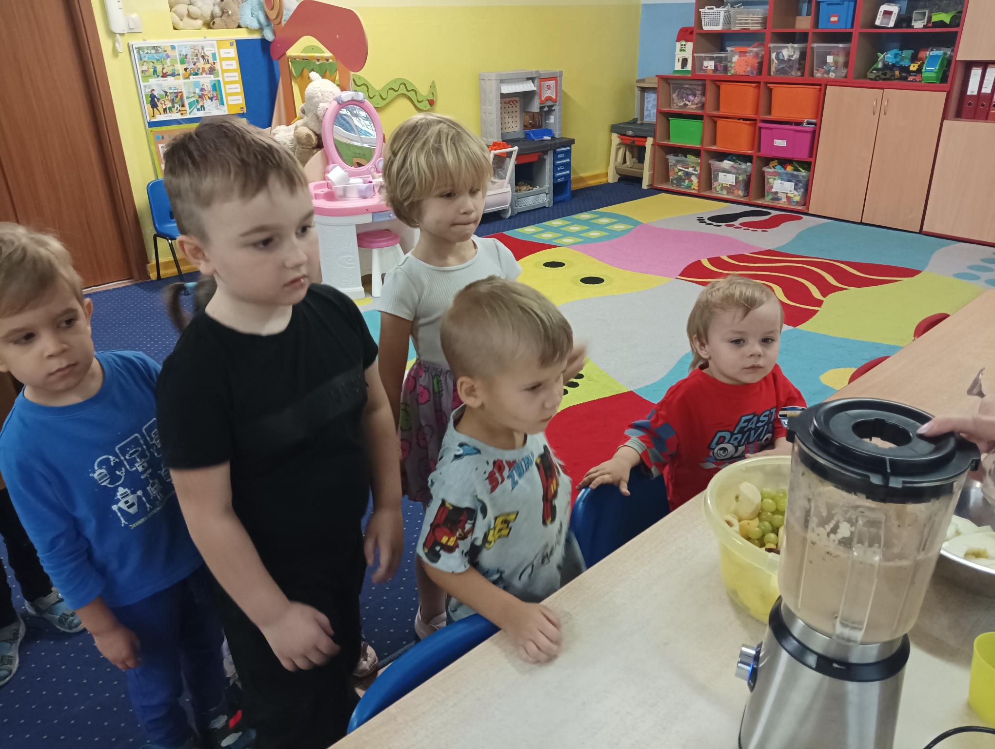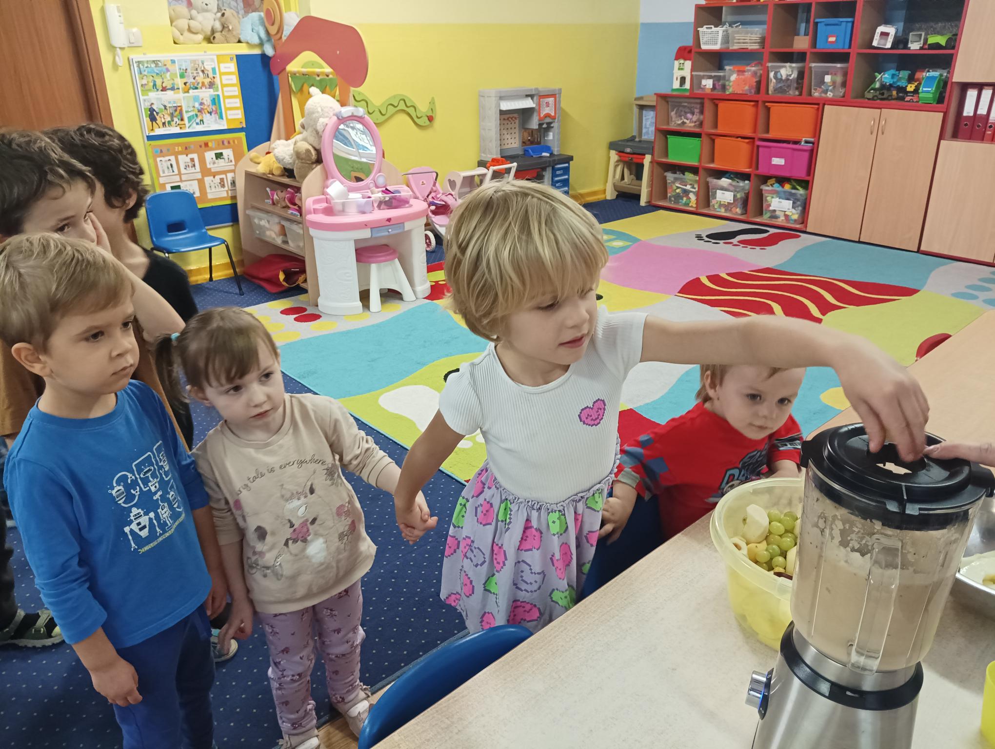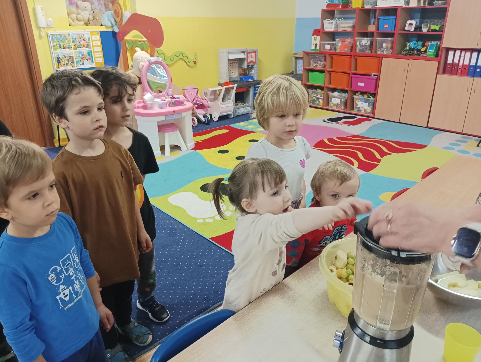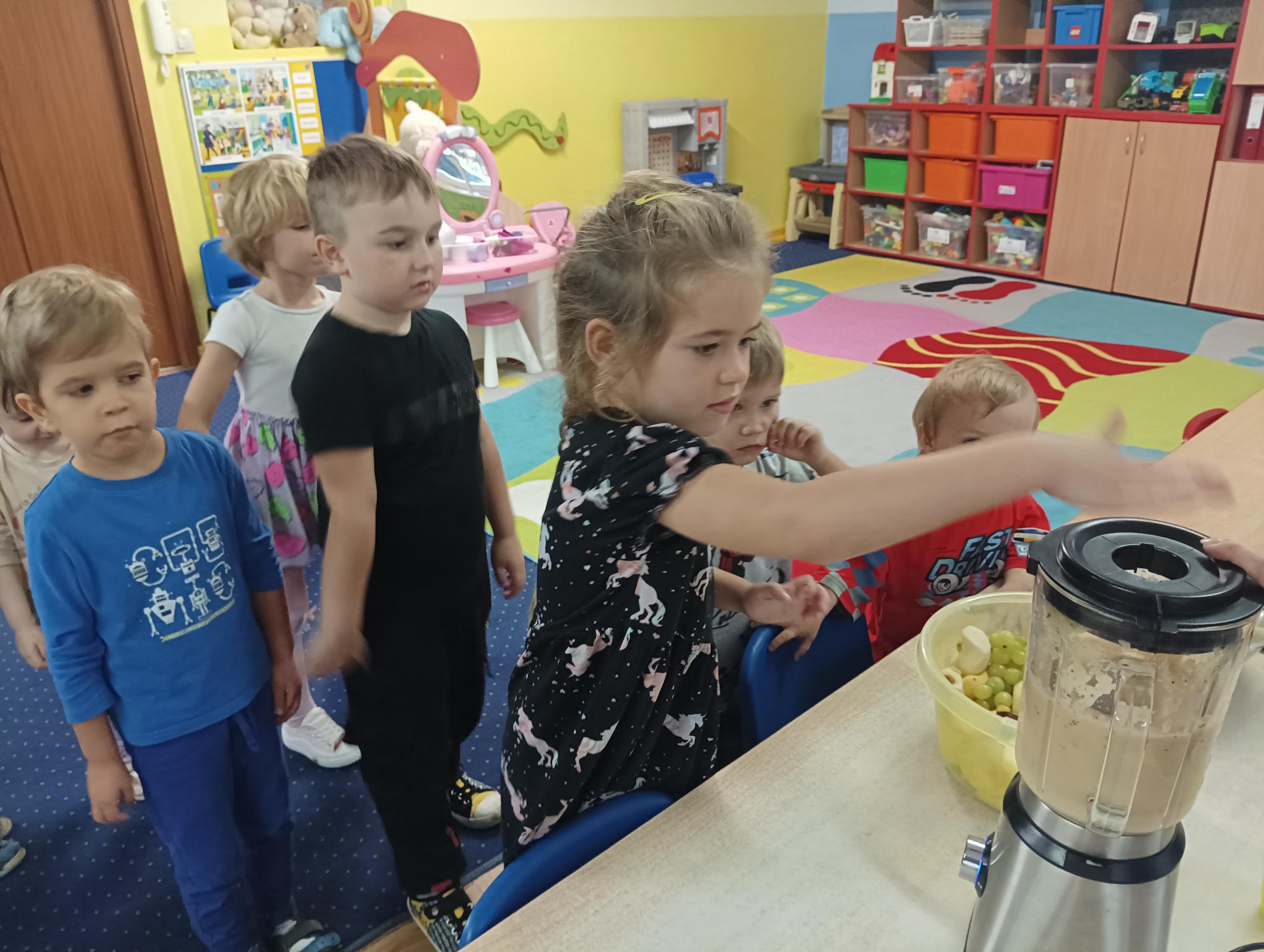 Podczas owocowego tygodnia dzieci przygotowywały sok z przyniesionych jabłek, gruszek. śliwek, pomarańczy i innych pysznych owoców.
