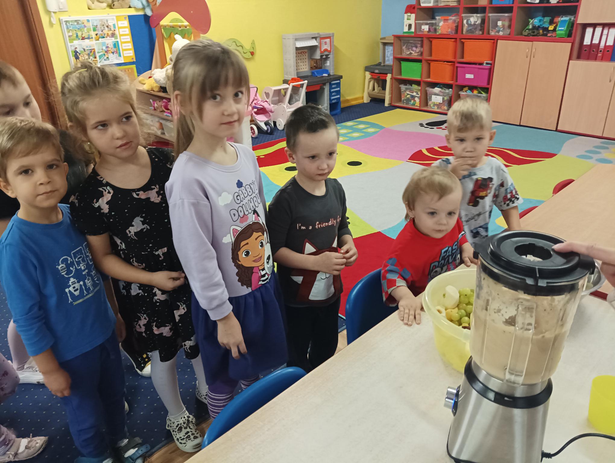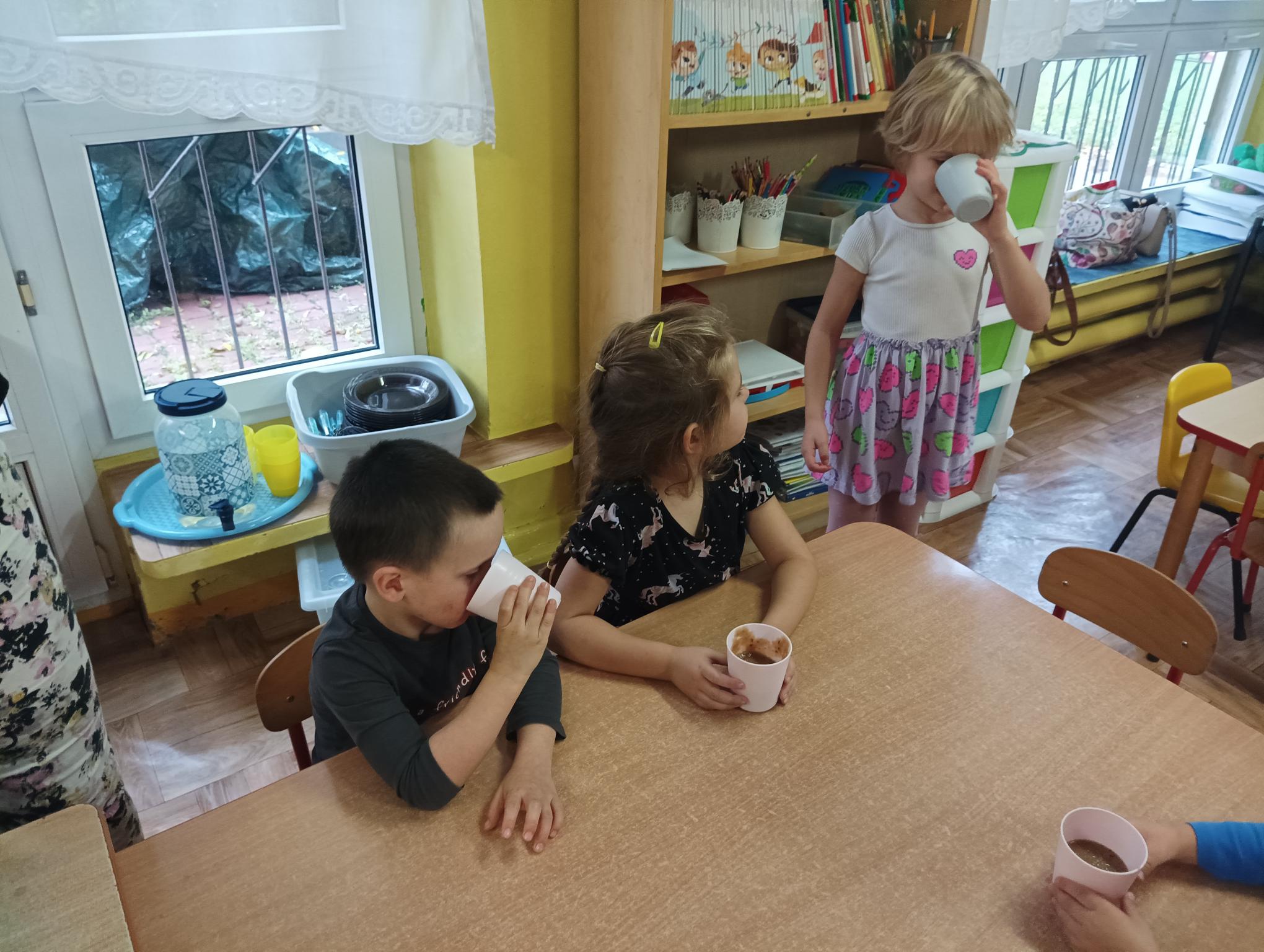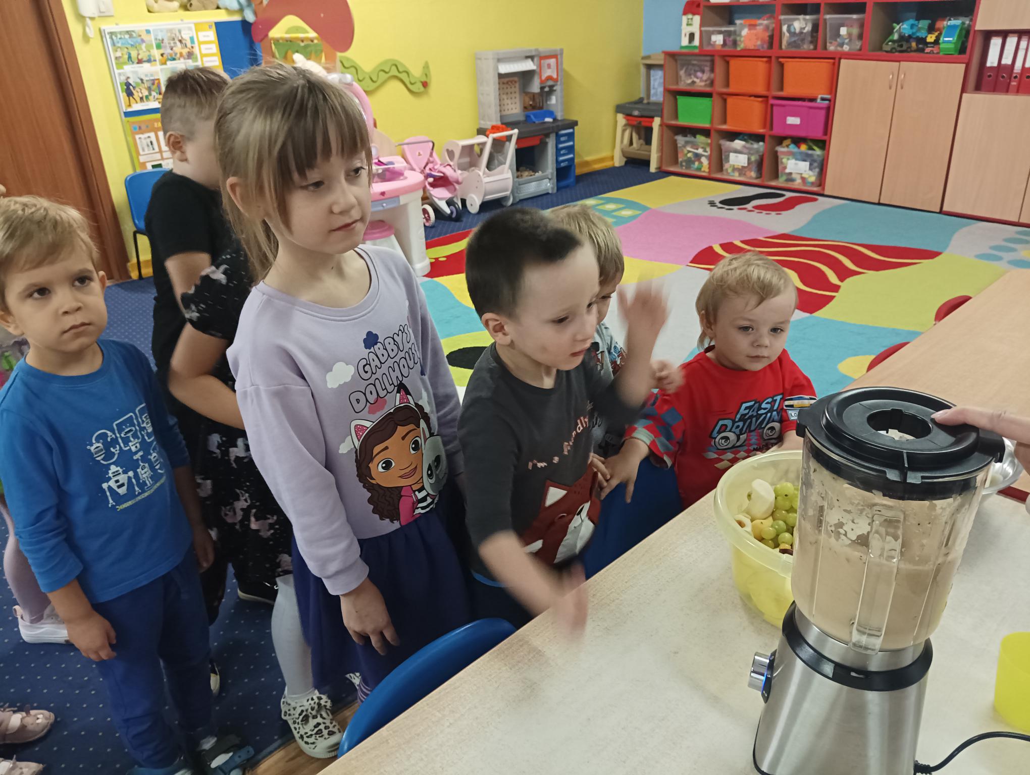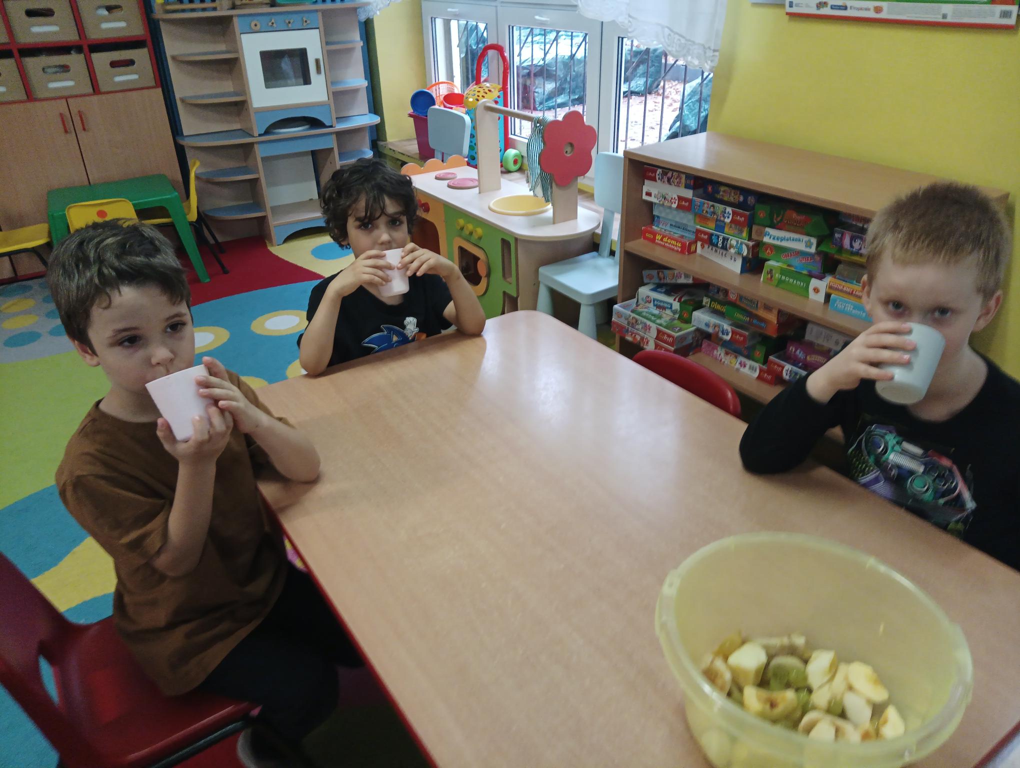 Podczas owocowego tygodnia dzieci przygotowywały sok z przyniesionych jabłek, gruszek. śliwek, pomarańczy i innych pysznych owoców.